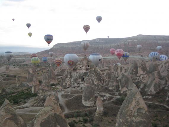 everywhere we looked from our balloon there were about this many other balloons in the air. here you can also see some of the cappadocia region’s volcanic formations, with some pigeon houses carved out. our balloon pilot would take us gently up one side of a formation and then back down the other. we only hit one tree!