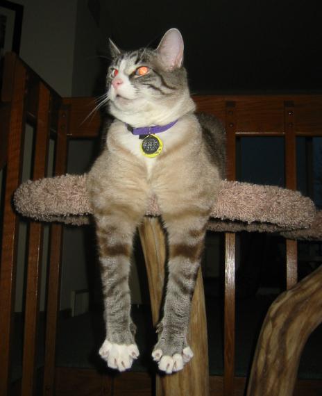 benton laying on the top part of the cat tree, stretching out his front legs.