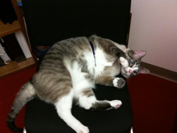benton relaxing on my wife’s visitor chair in her new office.