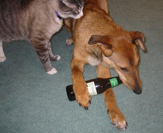 this is calvin, a collie mix we took care of for a few months. our cat benton is watching him enjoy an empty beer bottle.