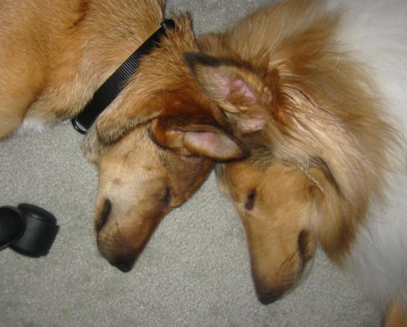 kylie would get scared and then get up and run away if one of the cats tried to lay next to her, but she didn’t seem to mind if calvin did it. you can see a desk chair wheel in the corner — i’m pretty sure calvin was laying under my chair.