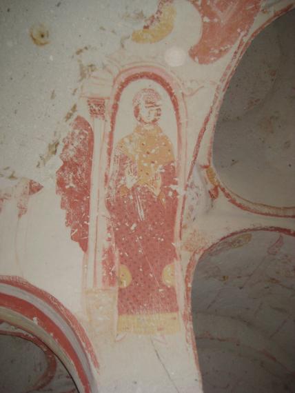 some sort of person painted on an archway in the cave church we found. most of the paint seemed to be red, with a little bit of yellow.