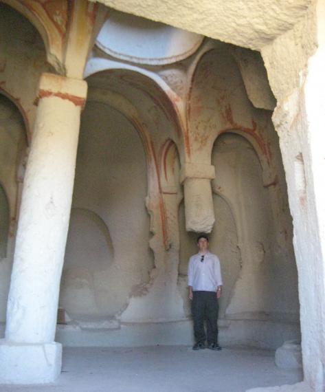 only one of the four pillars in this cave church was fully intact. two came down only about half way from the ceiling, and the fourth was completely missing. here i’m standing under one of the half pillars. you can also see how the light came in through a hole in the top dome.