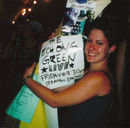 hugging one of the poles holding up the main exhibition tent, upon which we have already attached a sign announcing that echoing green is actually playing! we saw that they had a booth, and once the power went out and we were talking to them again, they asked us to help them out by putting up these signs! we got a cool experience and free stuff for our time.