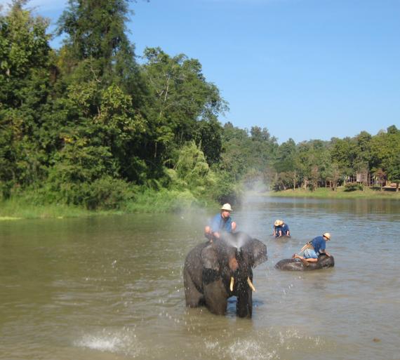 an elephant spraying water from his trunk. this was at the elephant conservation center.