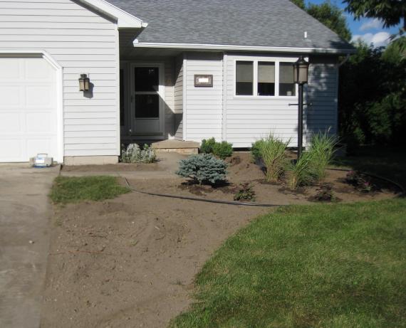 the front yard after the first full day of work. the dirt next to the driveway will be grass again in a few weeks. it had sunken down in that area to the point where the side of the concrete of the driveway was visible, so we had it filled in. you can also see the new light fixtures we put up ourselves recently on the side of the garage and on the post (the post itself is actually new as well). most of the new plants that go here are in place.
