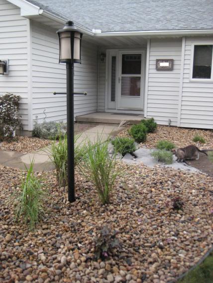 after the second full day, the post light has electricity again! benton’s checking out one of the catmint plants — he’s been scoping out the progress from inside the house during the day and then comes outside to look closer once the landscapers go home for the day. the rock mulch is mostly in and the last boxwood (which was waiting for the wire to get reconnected) as well as the plant by the garage are in.