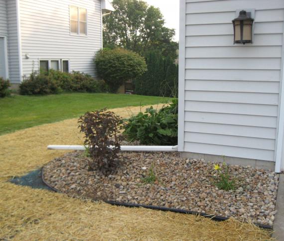 the north corner of the front of the house all finished up. you can see plenty of straw down to protect the grass that's growing where the bobcats drove to and from the backyard. also one of the new lights we put up before the landscapers came is easier to see in this picture.