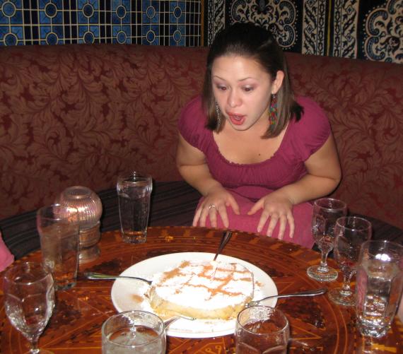 the day before emily’s birthday we ate at a moroccan restaurant and they brought out the dessert with a birthday candle on it. while she looks excited about the dessert, she’s actually about to gently blow out the candle to avoid blowing all the powdered sugar off the top of the dessert.