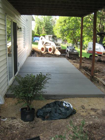 the concrete got poured in the afternoon, so we have our new patio now! it’s supposed to be usable in a couple days. you can see all three bobcats the landscapers have been using in this picture.