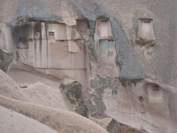 a closer shot of some pigeon houses taken as we floated past in our hot air balloon. the pigeon houses are used by the farmers in the area to collect fertilizer so they can grow their crops. they are dug out of the soft rock as a place pigeons can get into but their predators can’t.