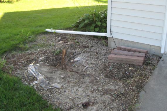 after the first half-day of work, the plants from the front corner of the house by the garage were gone, exposing the old bricks i had hiding behind one of the bushes. there used to be some sort of evergreen bush near the driveway, and a stump near the corner of the house. the hostas you can see around the side of the garage are staying, but getting broken up and spread the rest of the way down the side of the house.