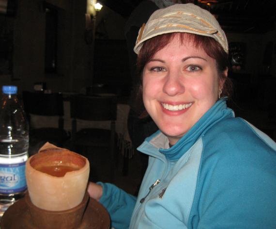 our second night in göreme we ate pottery kebaps at a local restaurant suggested by our guide for its low prices and good food. shown here is the bottom half of the pot the kebap (more of a stew) was cooked in. the top formed a sort of a chimney with about a one inch diameter opening. the pot was scored around the middle and you tapped it firmly with a hammer all the way around so you could lift off the top. most of us managed to crack our pots all the way around at the scoring but a couple cracked a little further down. i ended up crunching a little bit of pot with my dinner even though i had expertly separated my pot precisely around the middle.
