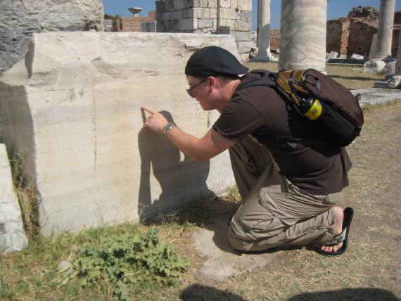 me reading the greek letters from a piece of saint john’s basilica. it’s a little difficult since they didn’t use spaces.