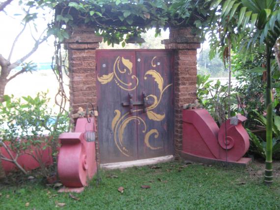 doors from one of the gardens to the river at the riverside guest house in lampang.