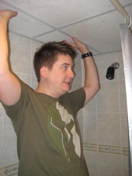 me demonstrating how little vertical space there was in the shower in our first hotel room of our thailand trip. i had to do a back bend to get my hair under the water, and i accidentally punched the ceiling when trying to rinse my armpits.