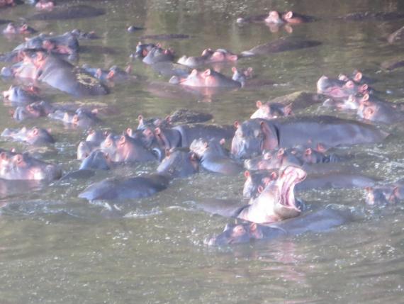 most of the hippos we saw were just standing around in the water like this. i managed to catch one yawning here though.