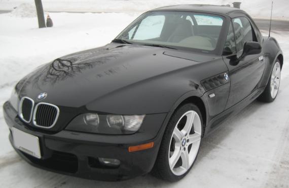 the z3 parked in the driveway with the hardtop on for the winter. you can see the new wheels, chrome door handles, and roadster front license plate frame we put on.